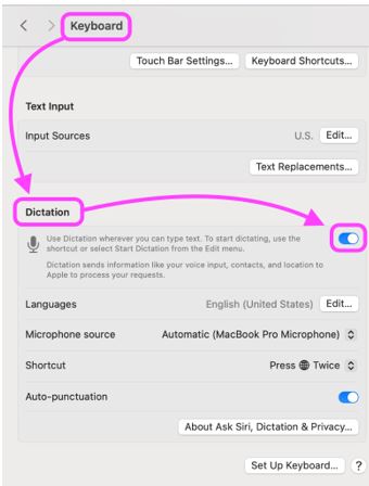 Mac Dictation software, System Preferences, Keyboard Screenshot